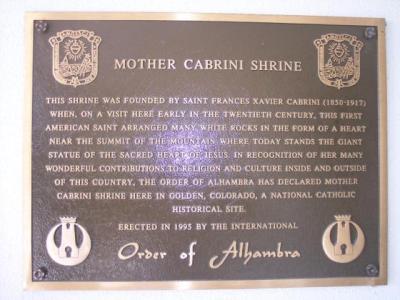 The Shrine was founded by Saint Frances Xavier Cabrini, (1850-1917) when, on a visit here early in the twentieth century, this first American Saint arranged many white rocks in the form of a heart near the summit of the mountain where today stands the giant statue of the Sacred Heart of Jesus. In recognition of her many contributions inside and outside of this country, the Order of Alhambra has declared Mother Cabrini Shrine a National Catholic Historical Site. Erected in 1995 by the International Order of Alhambra.